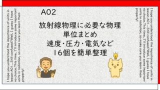 ワークブック解答A02 放射線物理に必要な物理単位まとめ|速度・圧力・電気など16個を簡単整理 単位ってたくさんあるけど、どの単位を覚えたらよいか、どこから手を付けたらよいか悩ましいですよね。私もかつてそうでした。単位は大事だから覚えろ!覚えろ!覚えろ!・・・と言われ続けてきました。このページではよく出てくる単位をリストアップしてあり... 2025.06.06ワークブック解答